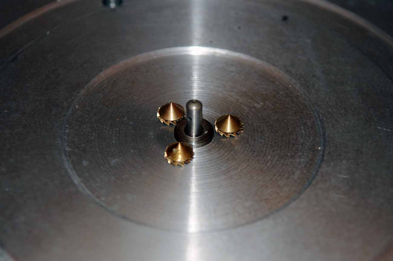 Пока хочу только обратить внимание на новое расположение конусков на диске. Их осталось, как видим, всего три штуки. Пластинка, таким образом, вывешена во времени и пространстве... Груз сверху при такой конфигурации выполняет исключительно механические функции, ибо при остановке пластинка, как маховик, прокручивается, собирая все конуски в кучу (клеить не рекомендую!).