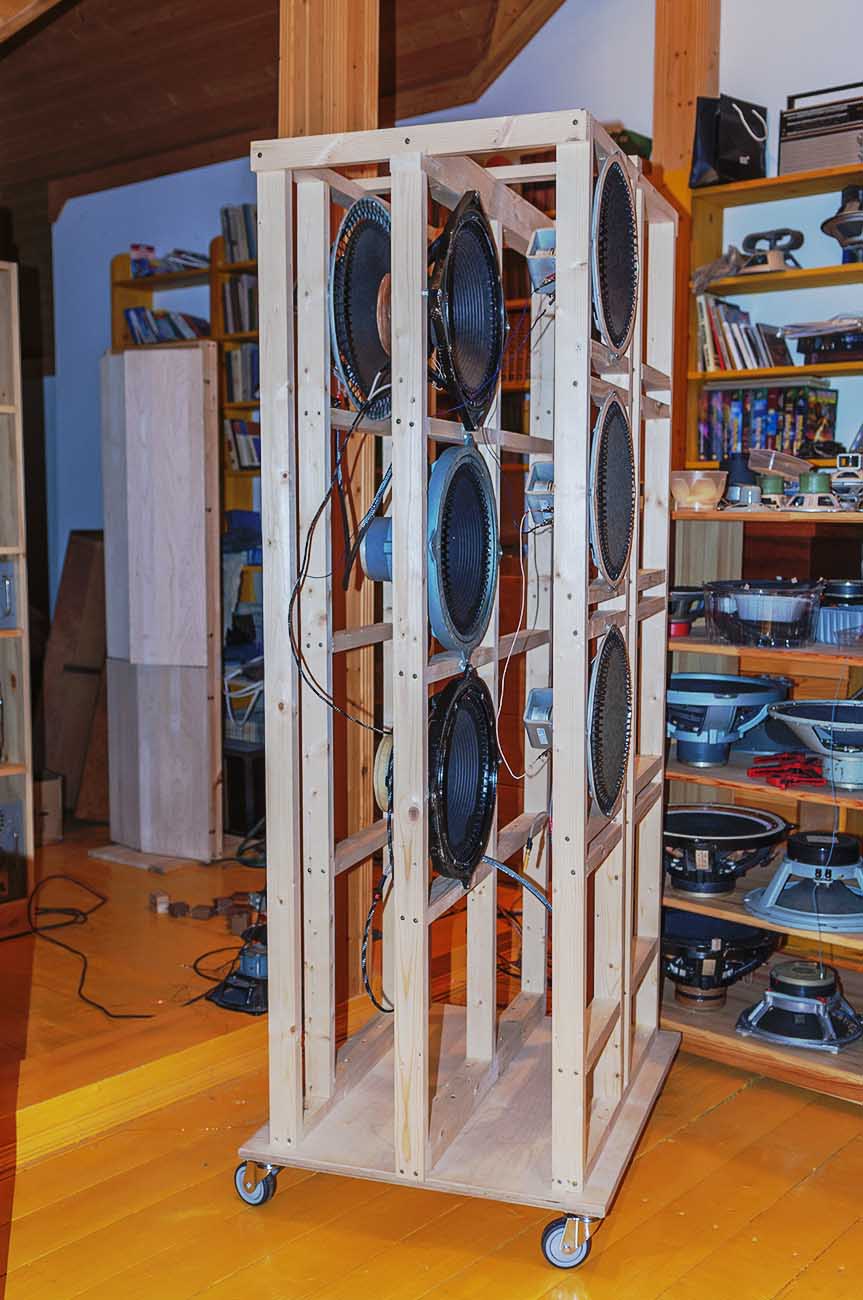 В процессе... всего вышеизложенного мною на этом сайте я и пришел к идее построить колонки, разместив динамики по слоям. Аккурат, как это делается в приличных семьях к празднику. То есть в виде торта "Наполеон". Так же, вроде бы, построена и моя большая система. Однако там нет четкой геометрической структуры, расположения настроенных динамиков. Тогда я не слишком понимал, куда иду, радуясь факту любого движения, как щенок сосиске. Теперь захотелось сделать что-то более осмысленное. Короче, заготовил я "дрова" для нового "насеста" и пошел потихоньку. Заглядываем, кому интересно. По дороге я буду рассказывать. Пока вот перекрутил динамики "из предыдущего анекдота" на новую сетку. Все, что было. И зафиксировал для истории стартовую позицию с помощью трио Рахманинова, которого потребовала душа amd. Точнее куска из его второй части... Части трио, понятно, а не amd... Слушаем, размышляем... AR-1 там стоит случайно (забыл прибрать игрушки) и, понятно, не играет в данной записи.