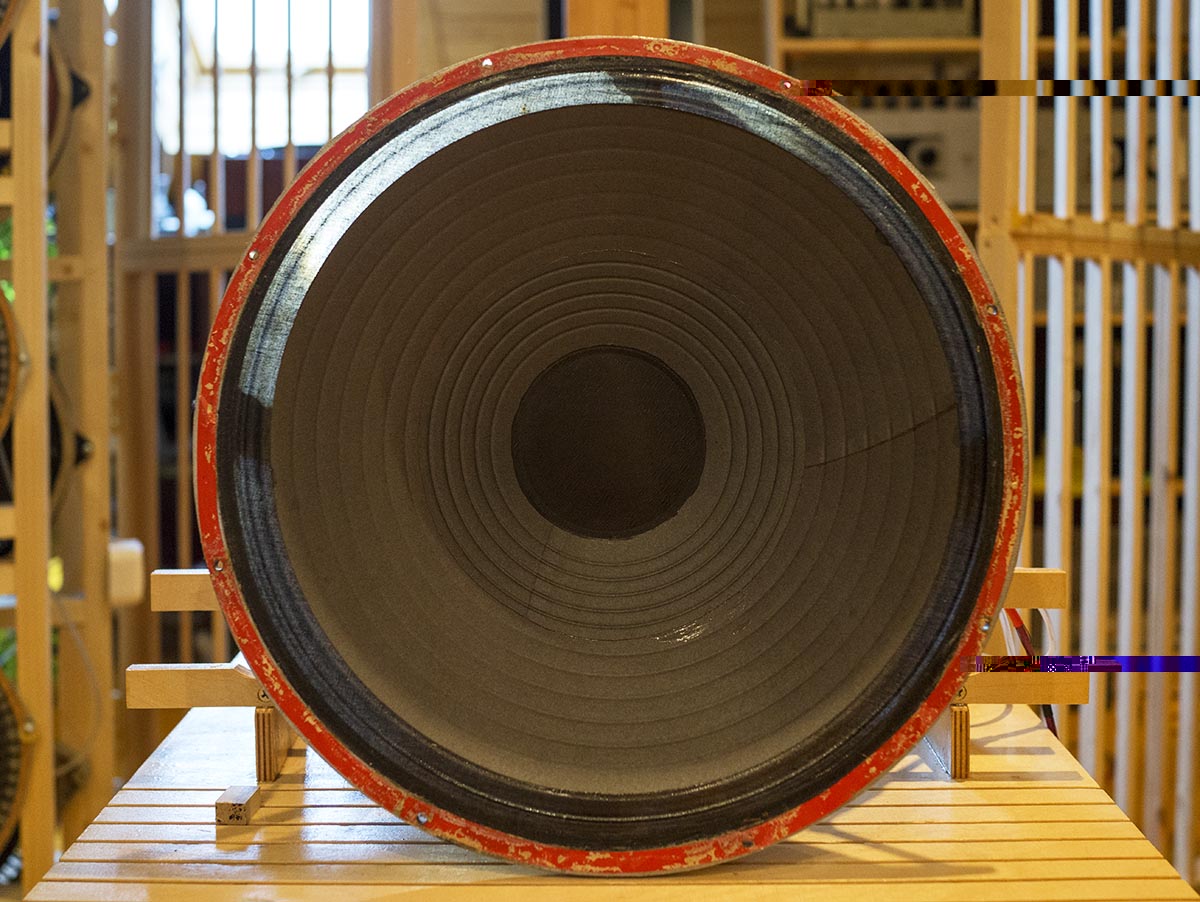 Судя по конструкции динамика, мы имеем дело с низкочастотником: пятнадцать дюймов, большая катушка с внушительной (12,6 Ом) намоткой, заглушенный "пятак" - промазанный звукопоглащающей мастикой стык катушки с диффузором и плотный пылезащитный купол.