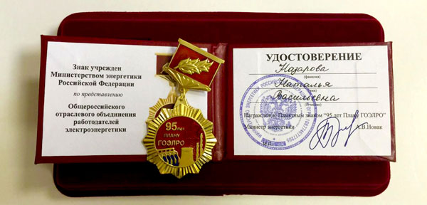 "В рамках торжественных мероприятий, посвященных празднованию 95-летия плана ГОЭЛРО и профессионального праздника — дня энергетика — Министерство энергетики Российской Федерации отметило руководителя нижегородского филиала группы компаний «ЕвроСибЭнерго», почетного энергетика России Наталью Назарову медалью — памятным знаком «95 лет плану ГОЭЛРО», за особые достижения на профессиональном поприще и большой личный вклад в развитие электроэнергетического комплекса."