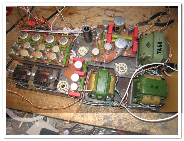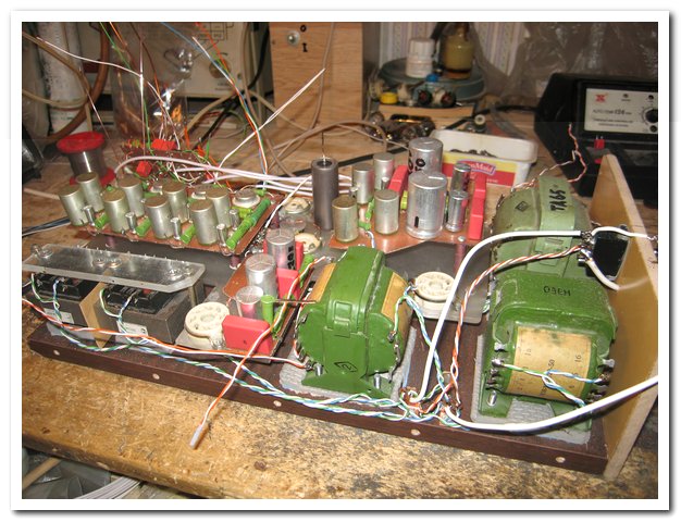 Соединил почти все.Остается надеяться.что ничего не забыл,а то будут проблемы.Осталось поставить 4 селена и присоединить плату с микросхемами.Ну и конечно поставить сами микросхемы.Прийдется тянуть провод заземления,подключать на землю электростатический коврик,браслет и паяльную станцию,чтобы не повредить от статического электричества микросхемы.Ну и поставить на корпус и подсоединить RCA разъемы.И,помолясь,можно будет попробовать включить.Вот как сейчас это все выглядит с другого ракурса.