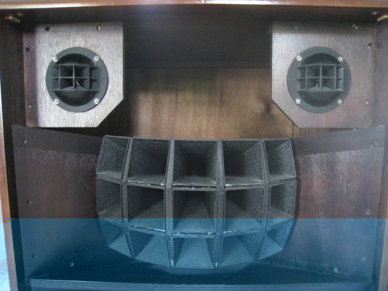 Были изготовлены боковые створки в виде цилиндрического рупора(подобия) с длиной образующей 510мм и высотой 470мм(по высоте колонок).Задача эксперимента:1.Минимизировать вредные ранние отражения от стен.2.Прослушать рупор(вернее некое его подобие).3.Прослушать ассиметрию(с помощью створок).
