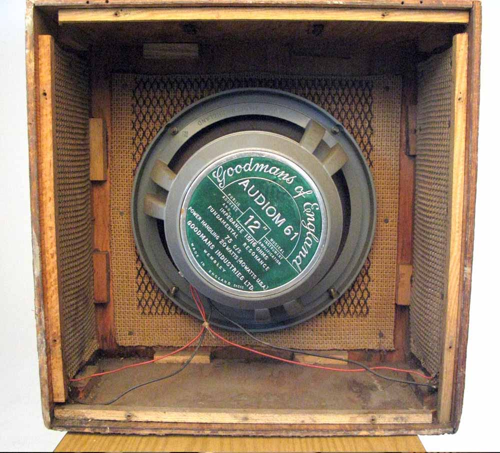На ebay сейчас продают такой вот комплект старых-разных Гудмансов в "родных" корпусах. Мало того, что все они открытые, так и, еще к тому же, между динамиком и передней панелью, заметьте, там проложена рифленая металлическая сетка, а уже потом - ткань и, собственно, фанера. То есть, динамик оторван от корпуса кабинета. Как учили...
