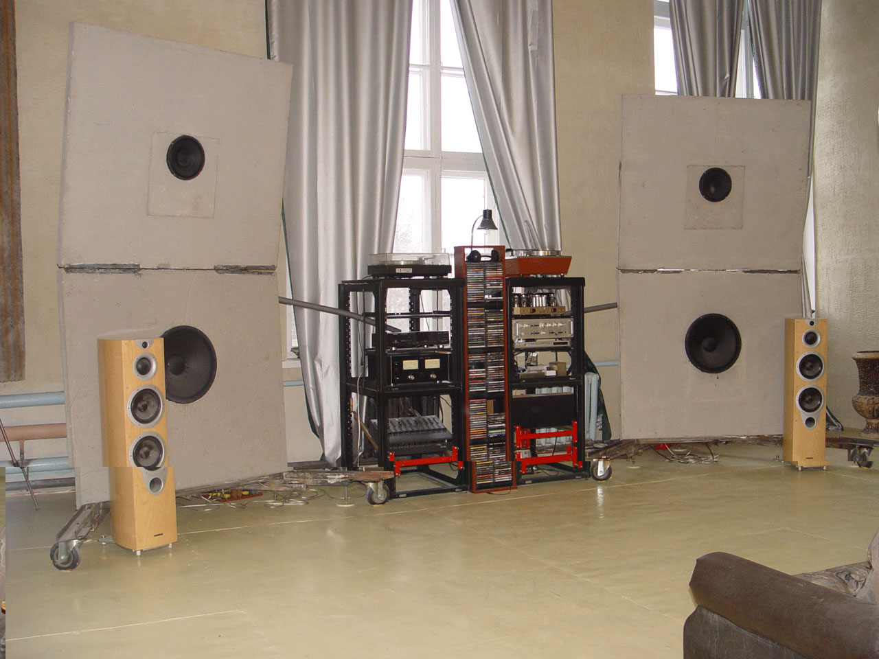 3 звук ну что можно ждать от такого экрана ,конечно дима сразу придавил нас к полу,мне очень интересна была работа экрана таких размеров в звуке,конечно ни одна мелкая система или альтеки там не создадут такое динамическое давление! оно понятно с первых звуков! конечно там все сырое и надо будет наверно все переделывать на несколько раз,но слитность звука и работа экрана здесь очевидна,после такого звука сложно включать мелкие системы.