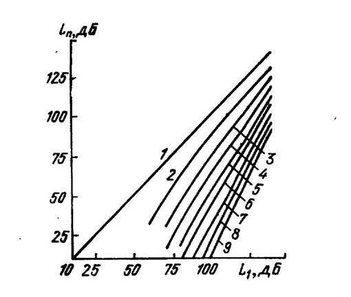 Рис. 1. Зависимость уровней интенсивности субъективных гармоник различных порядков от уровня тона, измеренного у входа в слу­ховой канал