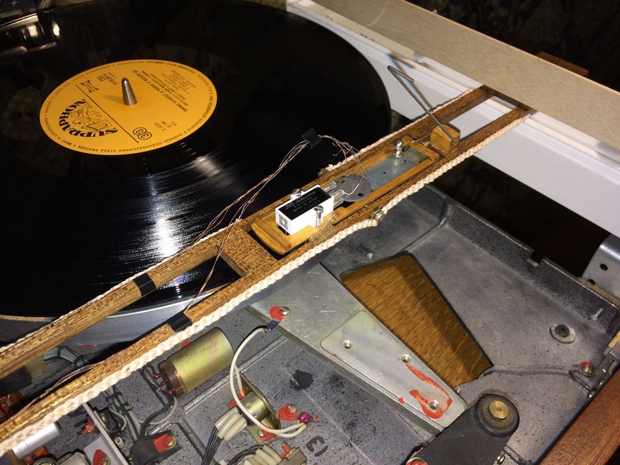Простейший микролифт работает, но оставляет желать… Подъем иглы – без проблем. А вот с опусканием проблемы есть: при опускании рука норовит придать тонарму нежелательное движение по радиусу пластинки. Я приспособился, но здесь явная тема для дальнейшего совершенствования – например, поставить микромоторчик с батарейкой и геркончиком. При поднесении магнита к геркону моторчик будет опускать иглу. Хотел так и сделать, но поленился пока. Тем не менее, все функционирует.