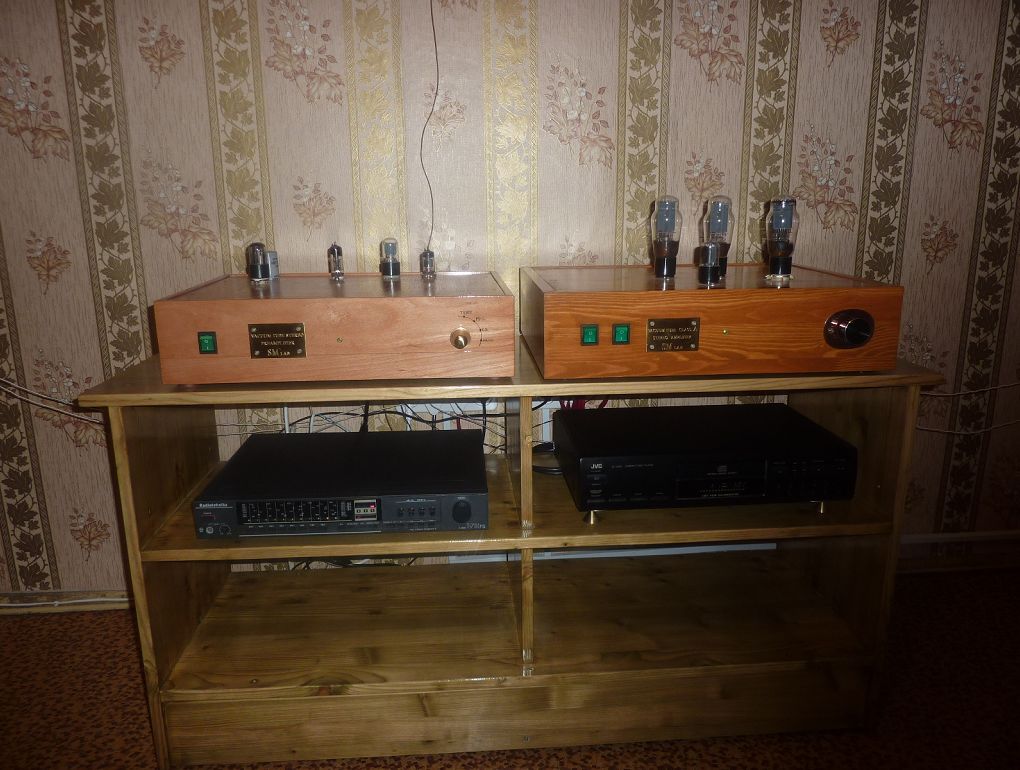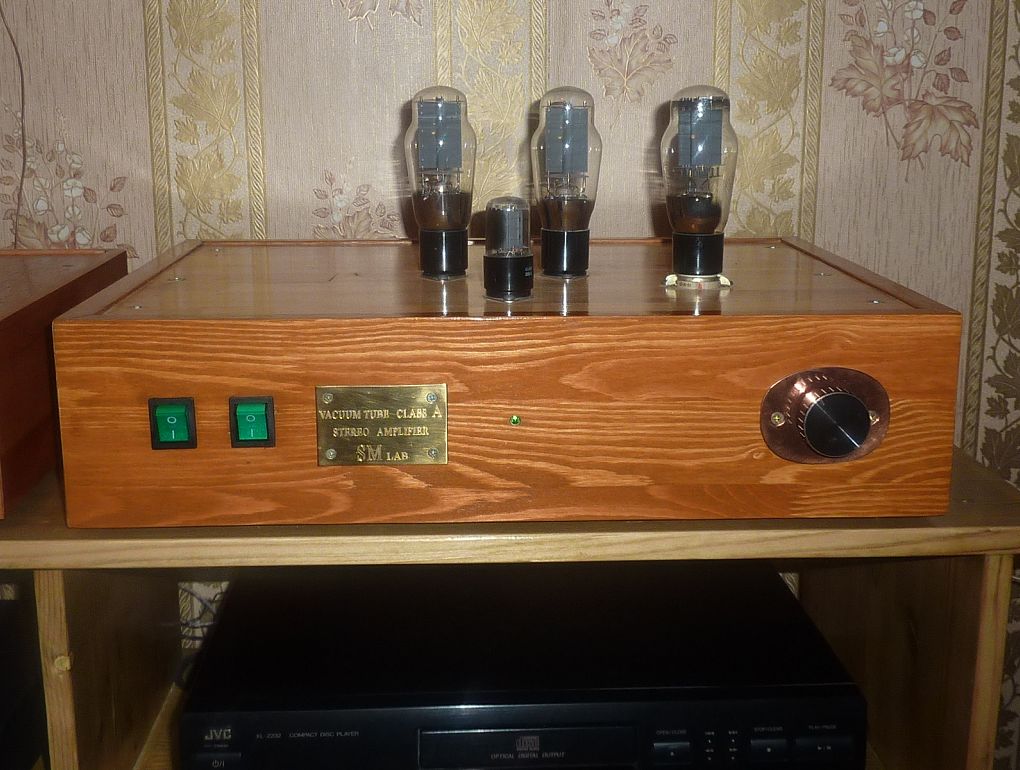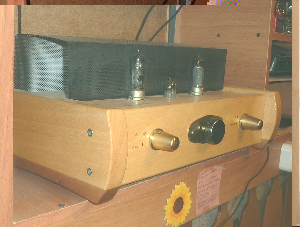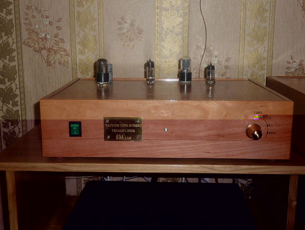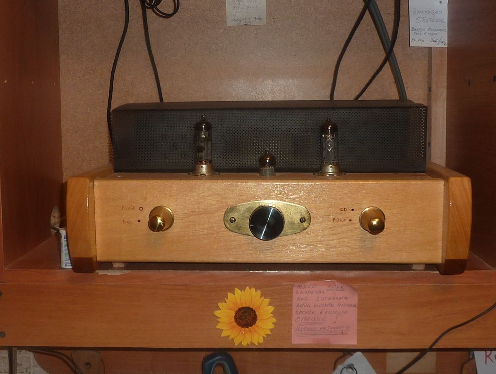 Постепенно аудиосистема приобретает законченный вид. Шасси усилителя помещено в корпус из старинного дерева и покрыто специальной восковой мастикой.Спереди будет тонированная стеклянная передняя панель.