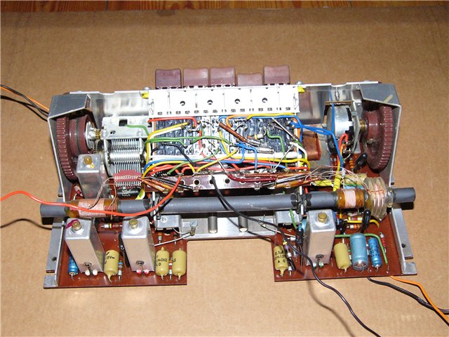ХАрактерен монтаж ,который применялся в переносных радиоприёмниках . Он очень рациональный и плотный . Что забавно , врятли можно будет в монтаже приёмника обнаружить академическую строгость ; всё практично, так как место мало и деталей много не напихаешь.