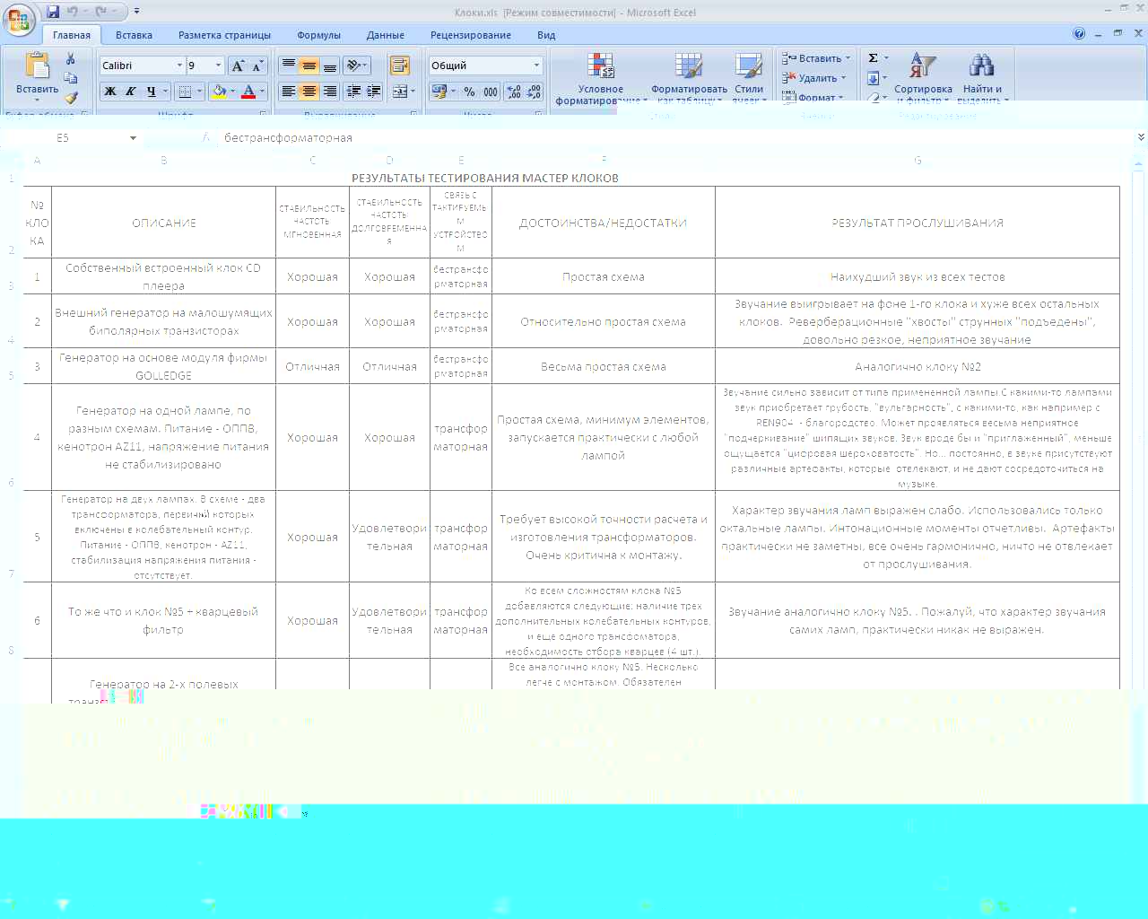 Встречая на различных форумах обсуждение мастер-клоков для CD, решил поуглубленее поизучать эту тему. Результаты оказались не совсем ожидаемые, см. приложенную таблицу. Сам был уверен, что лампы выиграют. А клок, вообще оказывает очень серьезное влияние на звучание. Генераторы подключались вместо штатного клока CD-плеера, больше тактовый сигнал никуда не подавался.