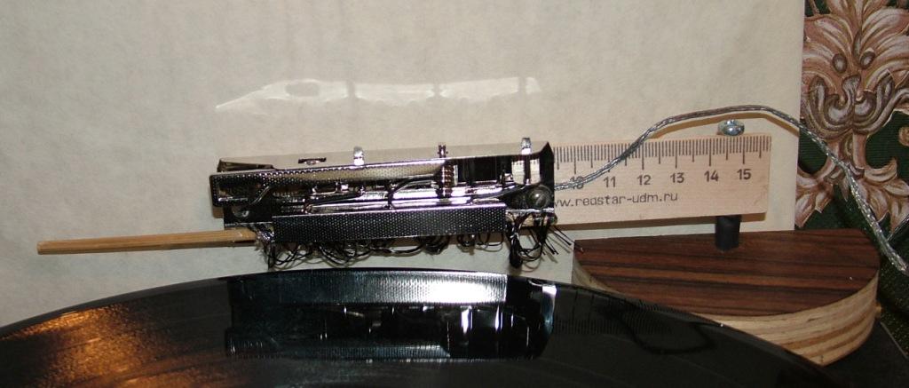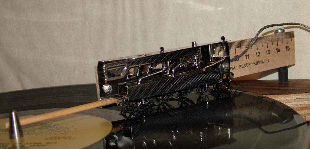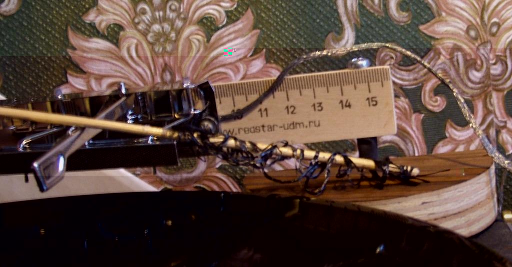 Зажим привинтил на линейку, под винт зажал отводящий провод, другой конец провода под винт на корпус. Под ось на линейке наклеил утолщение (не видно на снимках) и засверлил. Основание посадил на корпус на двусторонний скотч. Шпажку с бахромой зажал в зажим, так чтобы был хороший контакт волокна на металл.