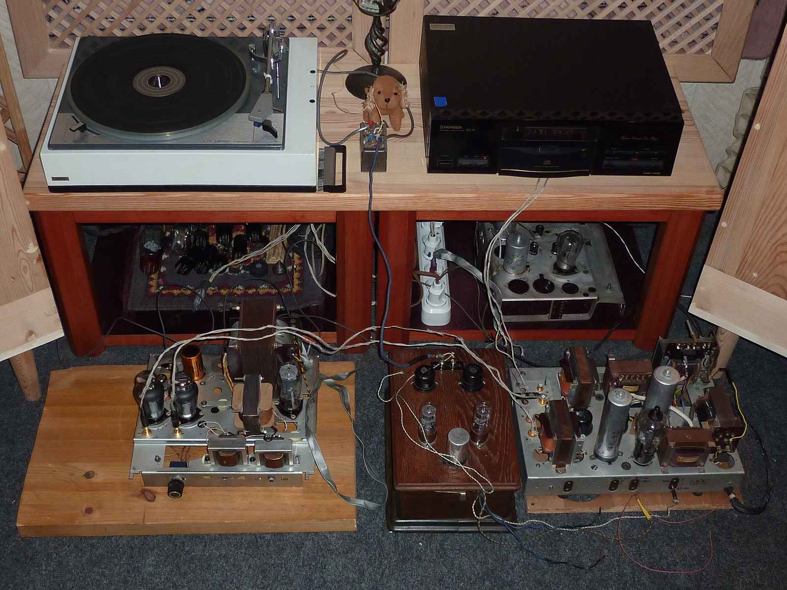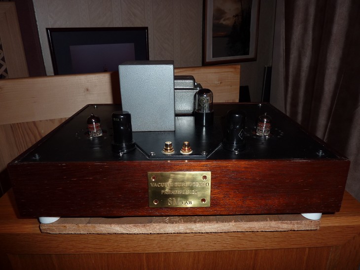 Слева на деревянном основании из ели - испытуемый усилитель для народного проекта : максимум музыкальности -за приемлемые деньги.