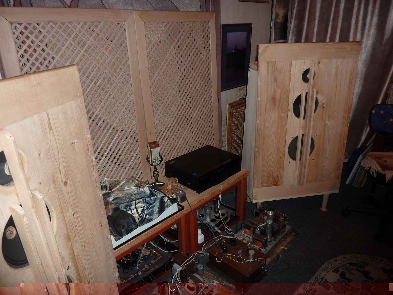 РАБОЧАЯ СИСТЕМА МИХАИЛА SM ДЛЯ ТЕСТИРОВАНИЯ НА ПРЕДМЕТ МУЗЫКАЛЬНОСТИ . Аудиосистема работает с акустическими системами открытого типа на ШП - громкоговорителях Телефункен 10" и 8"( на подмагничивании ) и 4,5 "-основной верх . На отраженный верх работают два 4" бумажных твитера Изофон, закрепленные на отражательной доске ,которая может менять угол наклона. 10" Телефункен и 8" - соединены последовательно и их общее сопротивление составляет 16 ом . 4,5" твитер соединен с усилителем через 1 мкф , а Изофоны-через 0,5 мкф . В состав системы входит буфер-усилитель на EF 14 с трансформаторным выходом и двумя блоками питания : один на одноанодном кенотроне - ОППВ -для питания непосредственно самого буфера ,а второй - на селеновом выпрямителе - питает отдельный RIAA-КОРРЕКТОР на ЕF12 и 6J5 ( 6С2С) . Корректор выполнен в раритетном деревянном корпусе от проигрывателя фоноваликов от фирмы Эдисон .