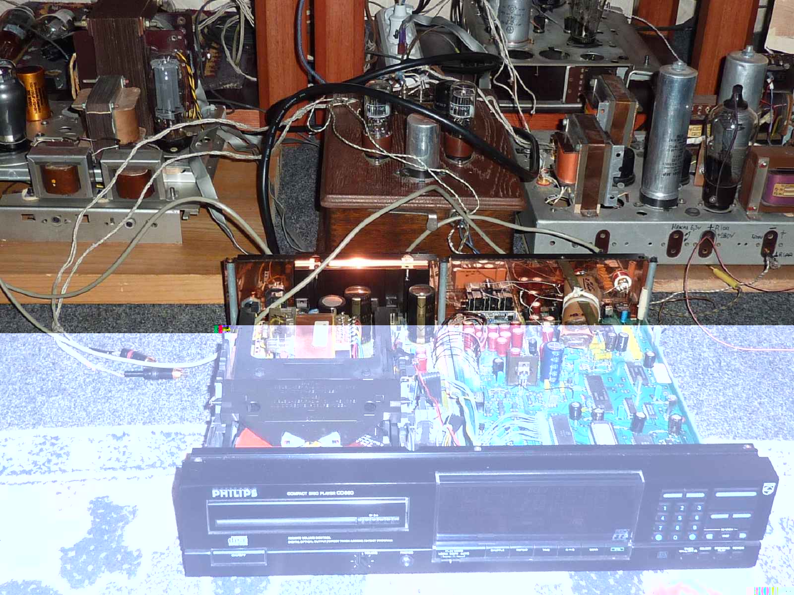 БУФЕР МИХАИЛА SM на лампе Телефункен EF14 для работы с СД-проигрывателем Пионер -75 .и RIAA-КОРРЕКТОРОМ. Сигнал с выхода ЦАПа подается непосредственно на вход буфера,который выдаёт почти 4 вольта амплитуды ,которая уже далее подаётся на оконечные усилители с выходного трансформатора на раритетном железе и проводе ( 1 :1 ) . Этим обеспечивается стандарт СД-источника,недосягаемый для любого Сд - источника ,имеющего микросхемный встроенный буфер. Питание буфера -ОППВ ,от старинного трансформатора Имериал и одноанодный приличный кенотрон или RGN1064. СЕРЫЕ БУДНИ - АПГРЕЙД СД ФИЛИПС -880.
