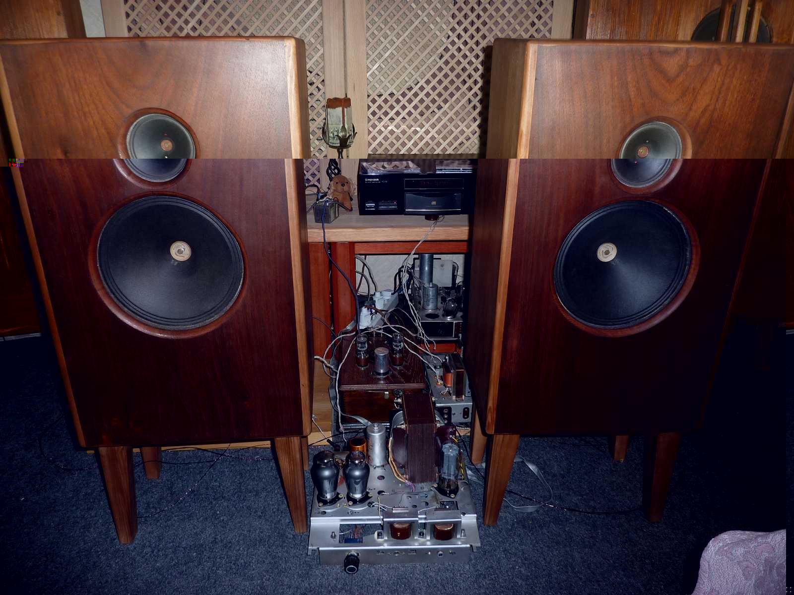 Внизу стоят Тверские монстры - моноблоки на ГМ-7О : ТРИ КАСКАДА , ТОЛЬКО ТРАНСФОРМАТОРНЫЕ СВЯЗИ , ТРАНСФОРМАТОРЫ - ТАНГО И БАРТОЛЛУЧИ ,газовые выпрямители и только фиксированное смещение - на кенотронах 5U4G -во всех трёх каскадах : первый - одноанодная 6в4G , ДАЛЕЕ - трансформатор Барталлучи 1 : 2 , далее- драйвер на ГМ70 с трансформатором той же фирмы ( 1 :1 ) и выходной каскад - ГМ-70 с Барталлучи . Бумагомаслянная концепция блока питания ДППВ , отдельное питание входного каскада и отдельно ( + 850 в 120 ма ) - драйверного и выходного : выход : 2 х 22 ватт , 15 -45 000 гц , итальянская музыкальность трансформаторов ( все мотались на заказ) .