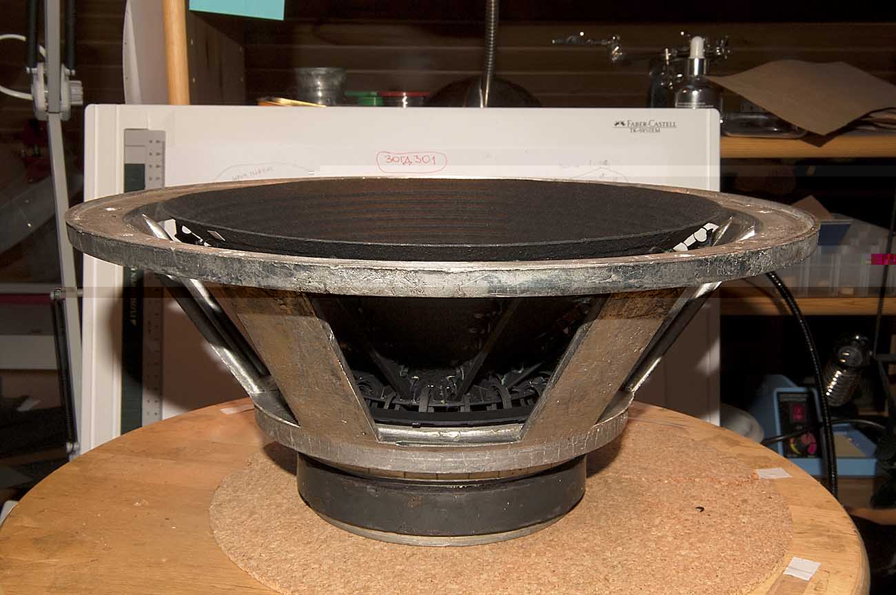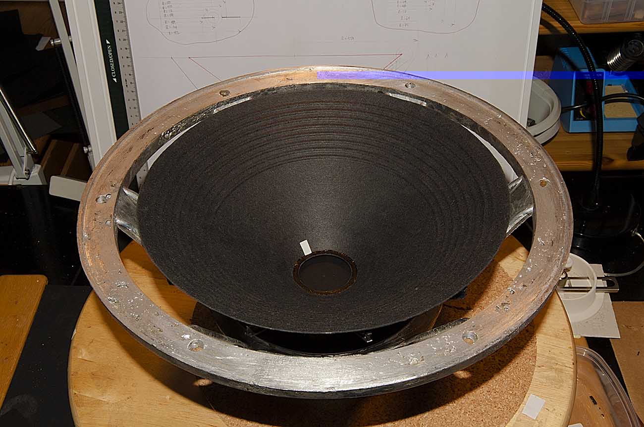 Сегодня утром послушал "первый голос" динамика. Пока без верхнего подвеса. Нижний прищепнул прищепками к корзине. Главный вопрос, который меня интересовал и страшил при этом - вопрос резонансов с связке: укосины-диффузор. Кажется, все держит достойно. О качестве звука судить пока преждевременно, однако, для истории выкладываю запись. Потом занятно будет сравнить с итоговым результатом.