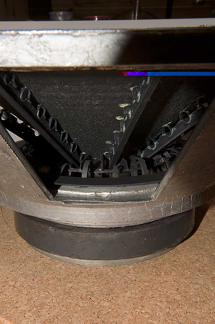 Дальше я наклеиваю на диффузор, сверху и снизу, по кромкам, два кольца, к которым креплю пушпульные подвесы. Кинематически констукция здесь распадается на два контура. Привод от катушки взаимодействует с подвесом только опосредовано через диффузор.