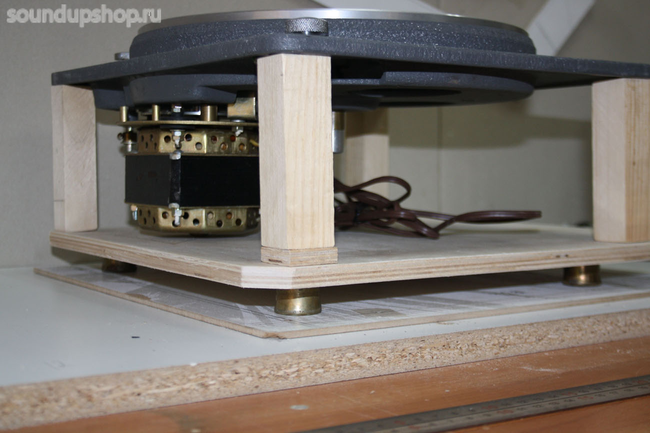 Конструкция все ближе и ближе к замыслу. Особенности ее видно на снимках. Добавлю только, что плашка с RCA-разъемами будет крепиться к деревянной крышке, тогда как сетевая колодка привинчена к металлическому основанию. Таким образом вертушка сможет легко разделяться на две, никак не связанные друг с другом, части. Что, согласимся, удобно и полезно во всех отношениях...