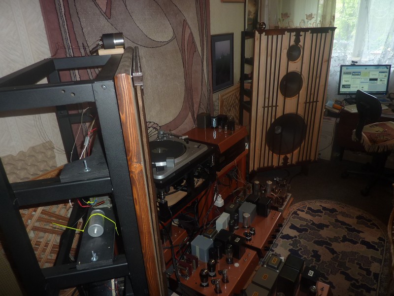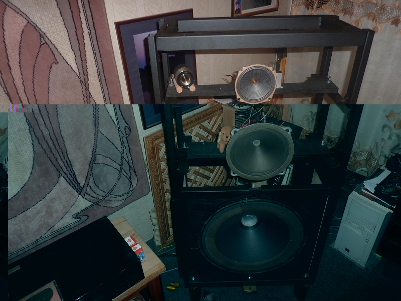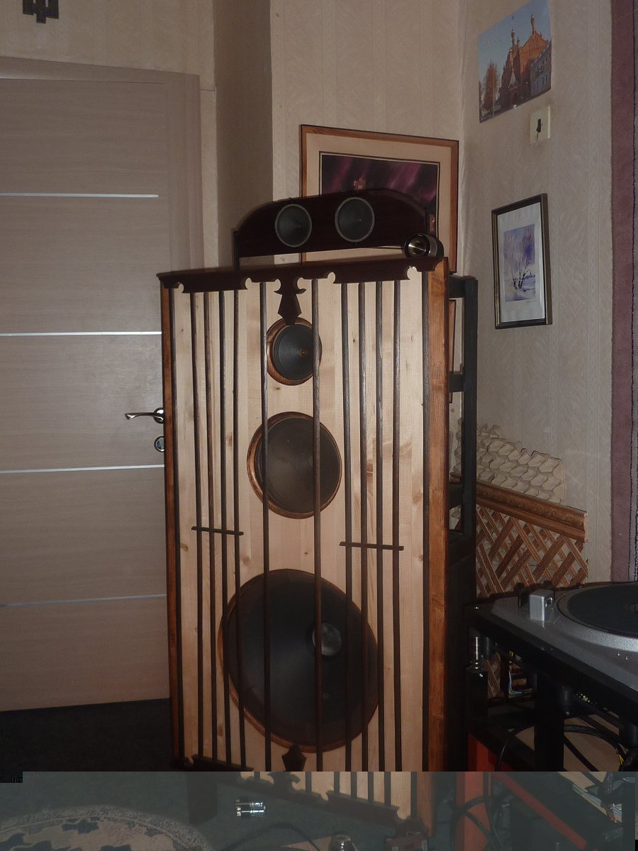 Акустические системы открытого типа в режиме создания и тестовых прогонов - на базе авторских динамиков Михаила Уракова ( 18"Биг Босс и ВЧ- твиттер на подмагничивании ) , 10" Телефункен на подмагничив. ( 39 г) и Fostex . Пока без дополнительного щита для ВЧ Сименс VAC - для основного отраженного верха (или прямого ) .