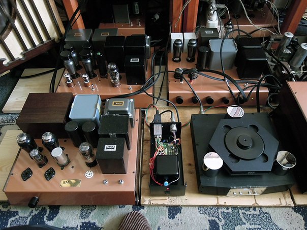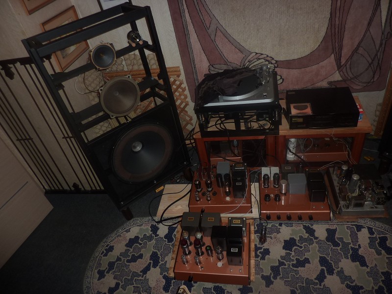 Тестирование верхнего СД-транспорта С.Е.С. ТL0 в составе ламповой биампинговой системы , куда входит : ДАК SMlab на ВВ-63-К ( в фото не вошёл) , ( сзади за TL0) предусилитель с темброблоком на лампах ЕL11, EF14 , RGN 1404 , усилитель S.E. 4 ватта AL5, ECC32 ( или 2 х 6J5) , U52 ( мид бас и выше ) , (сзади слева) усилитель Р.S.E. 8 ватт на сдвоенных EL12spez. , ECC32 ( 6SN7) , U52 . ( мид бас -бас )