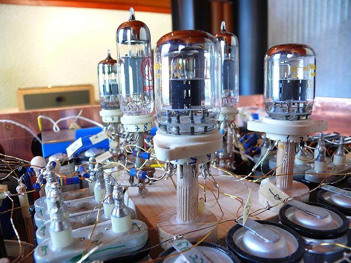 Отдельно делаются деревянные несущие боковины . Они имеют дизайнерский контекст , цвет - на вкус , само дерево - можно старинную ель или на основе дельтадревесины от довоенных приемников , можно просто доски дорого паркета . Эти несущие боковины как-бы вставляются с боков медного шасси и шасси на них опирается. Крепится шасси к боковинам тремя винтами - два сверху и один -с торца шасси.