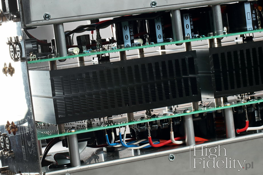 “...По бокам имеются крупные тороидальные трансформаторы, привинченные вертикально к экрану, отделяющему их от элементов схемы - один обеспечивает питание, а другой - выходной трансформатор. Выходная мощность одинакова для нагрузок 4 Ом и 8 Ом. Выходной каскад работает в двухтактной конфигурации. Пушпул по два транзистора на канал. Мало того, что каждый канал имеет собственный источник питания, но и каждый каскад питается от отдельной вторичной обмотки. Это один из немногих случаев, когда сбалансированное соединение может предлагать лучшие звуковые результаты, чем SE решение.